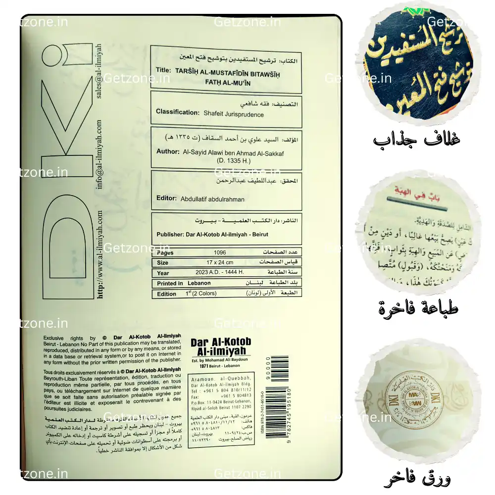 كتاب نفيس في الفقه الشافعي ملون شرح فيه المؤلف كتاب فتح المعين وركز على الكلام الدقيق المعنى فأوضح المراد منه بعبارة سهلة وأورد أقوال كبار الفقهاء في أهم المسائل وذكر فيه الكثير من الفوائد